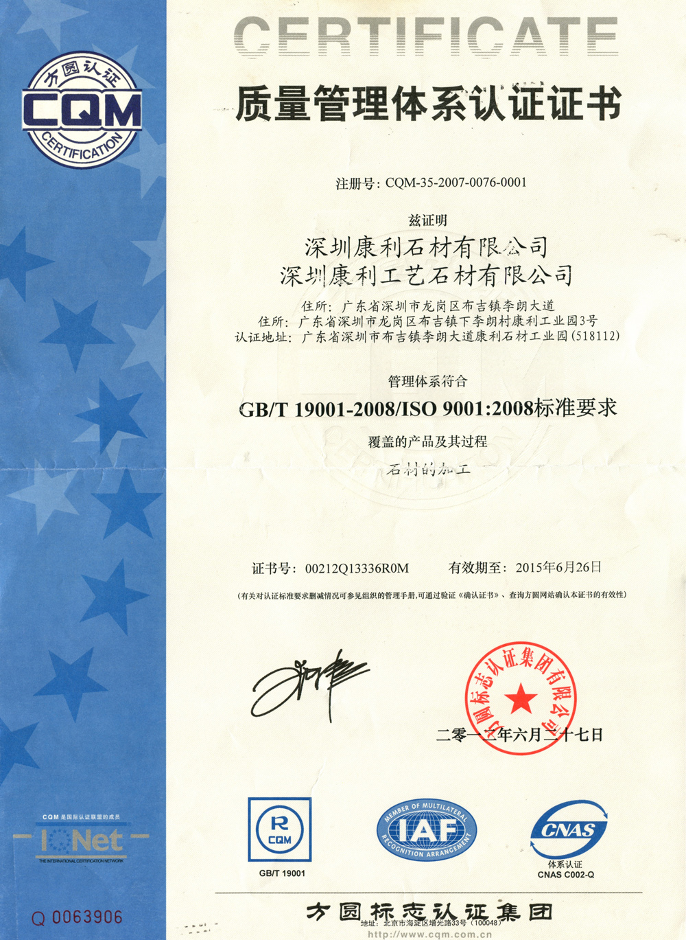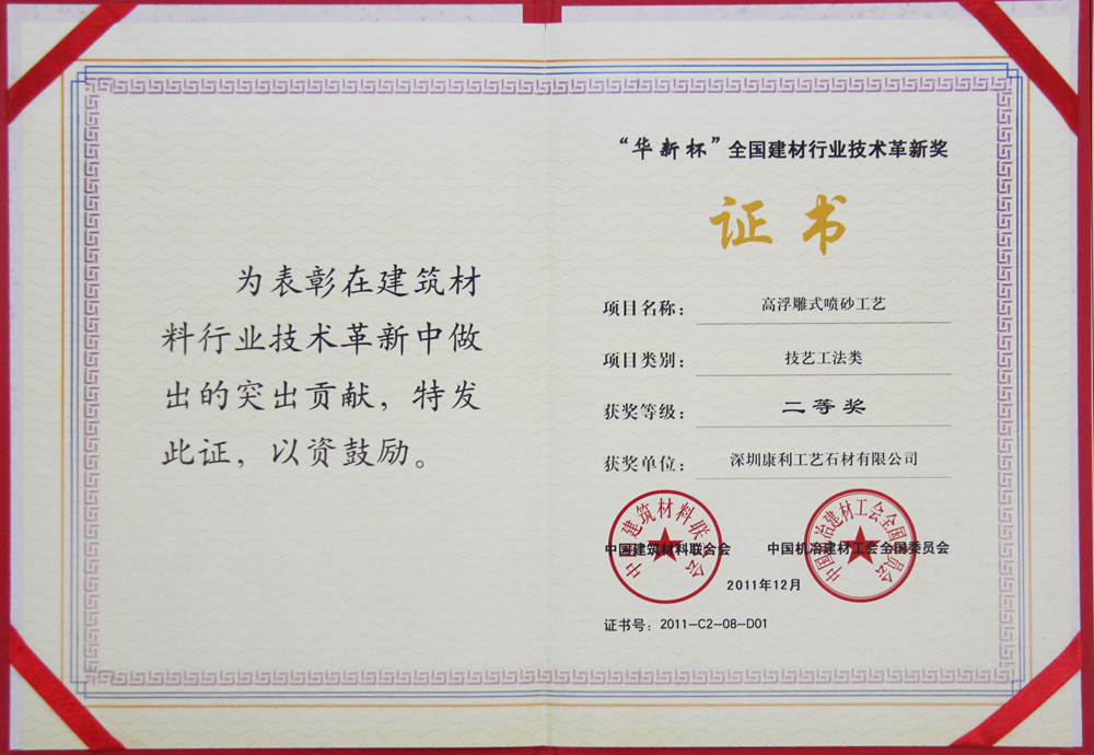康利建立了完善的質(zhì)量保證體系,是行業(yè)中率先通過ISO9001質(zhì)量管理體系認證、ISO14001環(huán)境管理體系認證的企業(yè),并且是石材國家標(biāo)準(zhǔn)《天然大理石建筑板材》、《天然花崗石建筑板材》的起草單位之一。